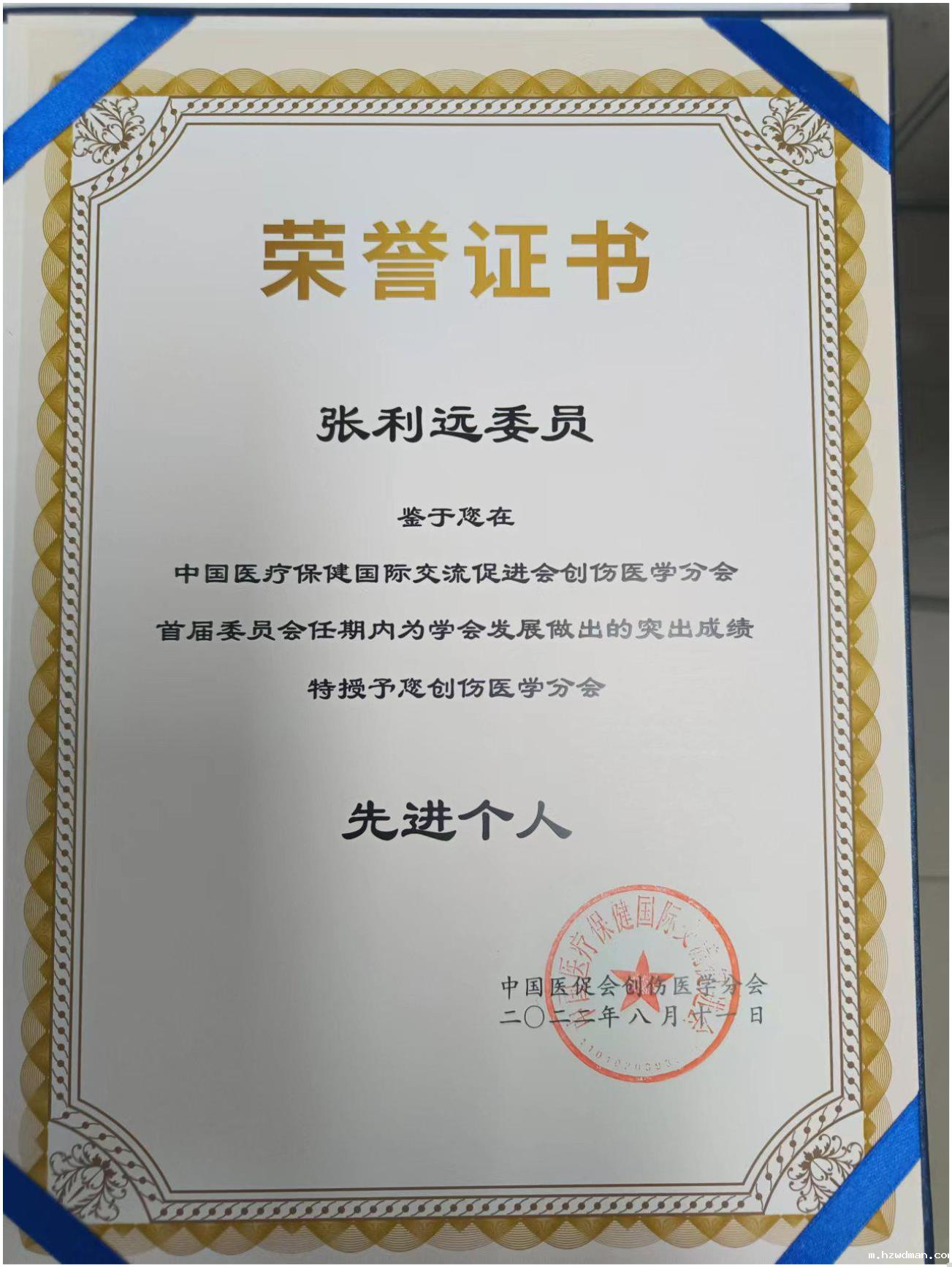 2022 年 8 月 11-12 日,中国医疗保健国际交流促进会创伤分会在南京召开“第三届华夏创伤医学大会”暨“创伤分会第二届换届选举大会”,张利远教授以出色成绩受到大会表彰与颁奖,并当选分会“常委”。