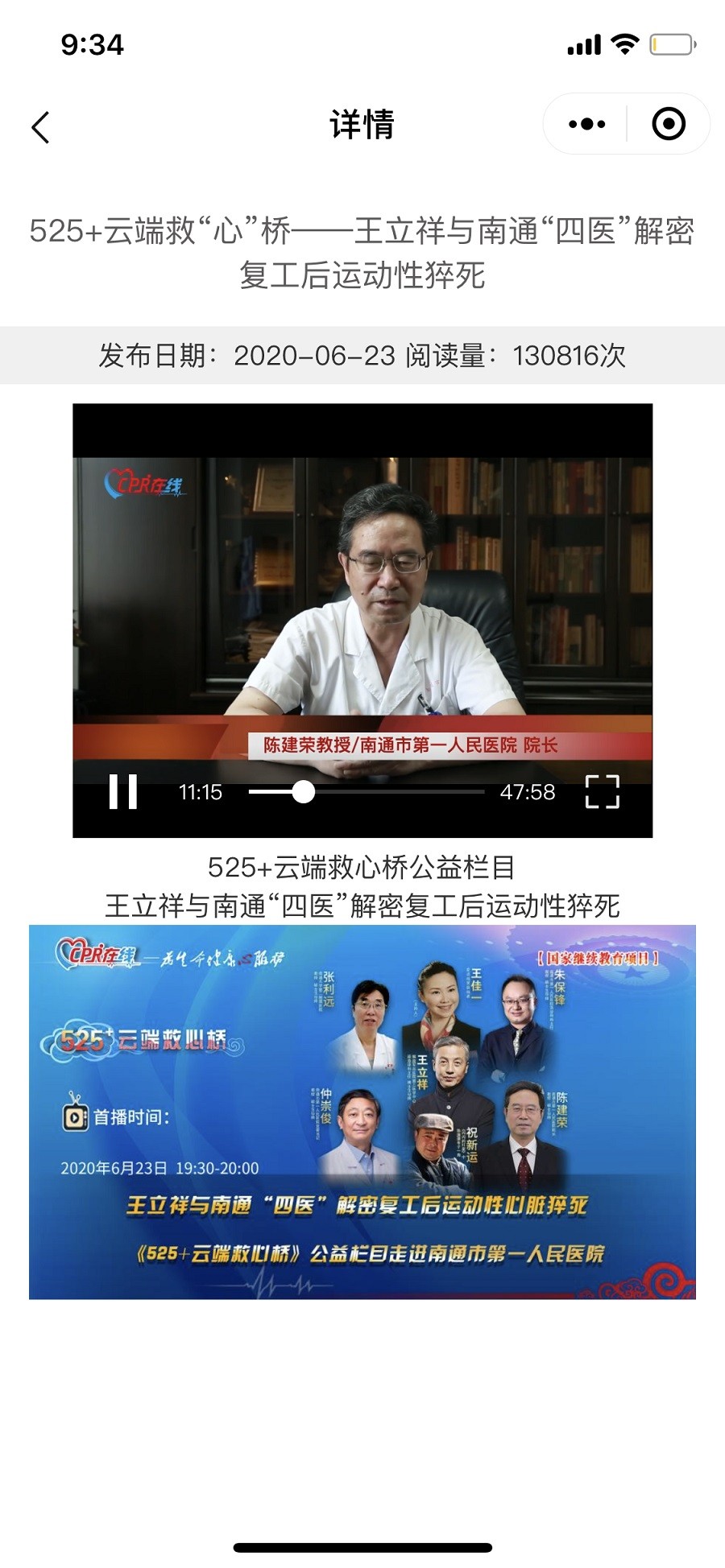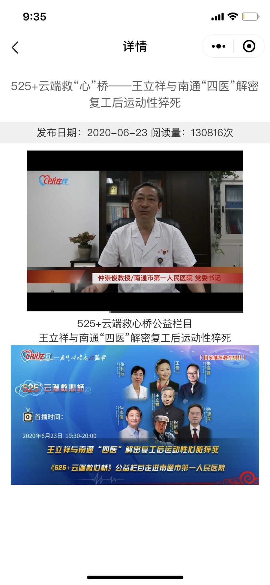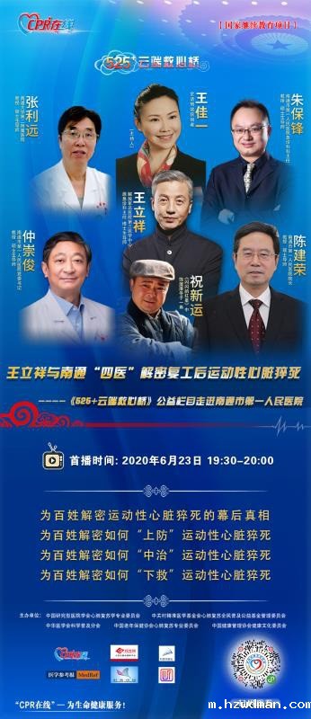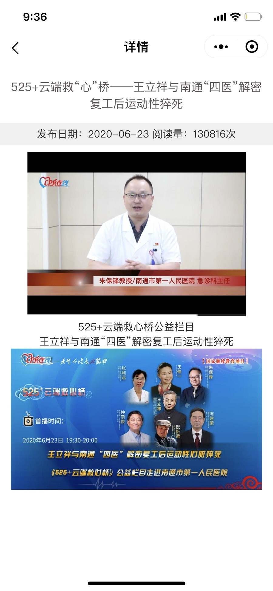 针对时常发生运动场猝死,中国心肺复苏委员会主任委员、解放军总医院王立祥教授组织CPR在线“525-云端救心桥”,安排我院陈建荣、仲崇俊、张利远、朱保锋四位教授“为百姓解密运动性心脏猝死”。专家分别从分析猝死发生因素同时,为百姓解密猝死发生机制,使百姓认识运动性猝死本质,懂得预防,学会急救。由于心肺复苏研究时刻,对运动性心脏猝死解析透彻,2020年6月23日晚上,当时在线学习达100万多人。受到一致好评。