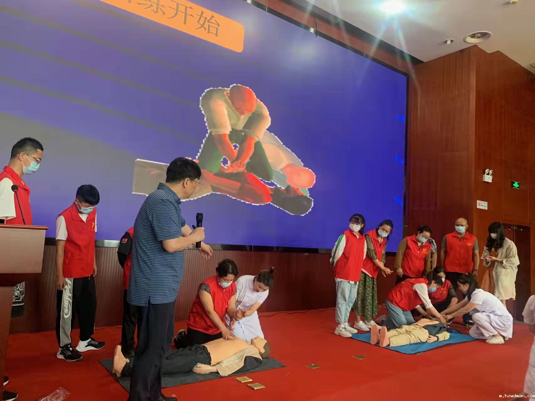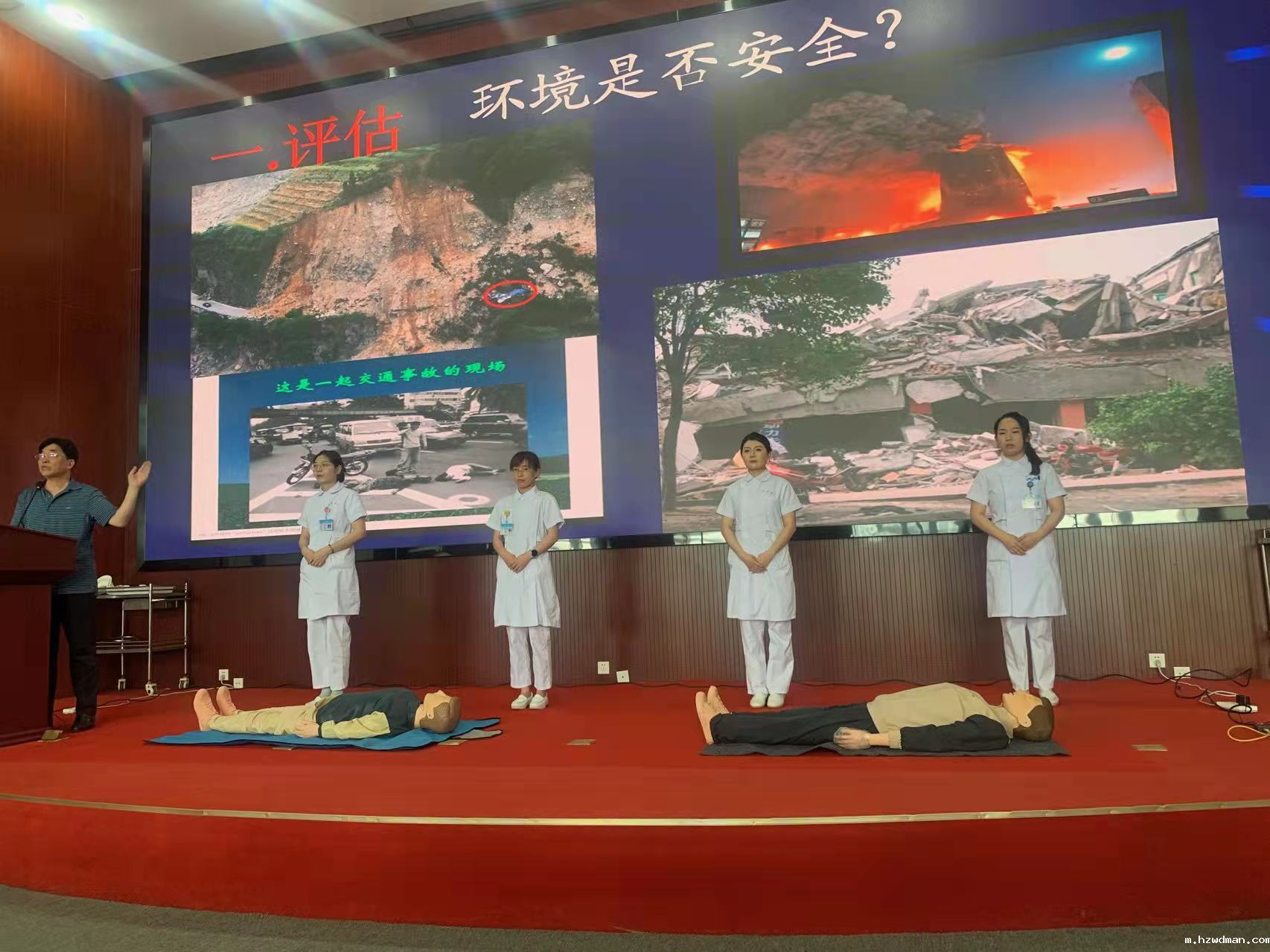 张利远讲解“心肺复苏”九步同时,护士给予同步演示,使大家易学、易懂示……