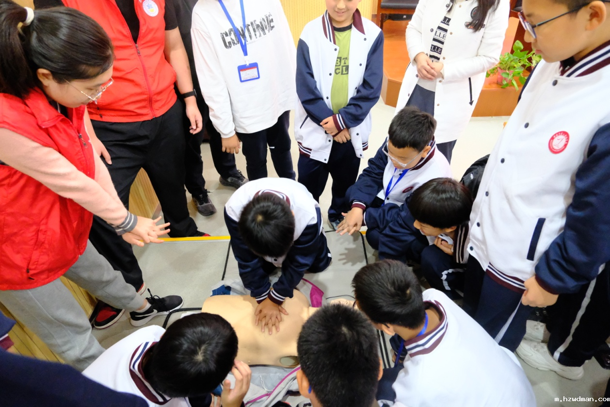 志愿者们为学生们进行了心肺复苏、解除气道异物梗阻、AED(自动除颤仪)等技能培训。