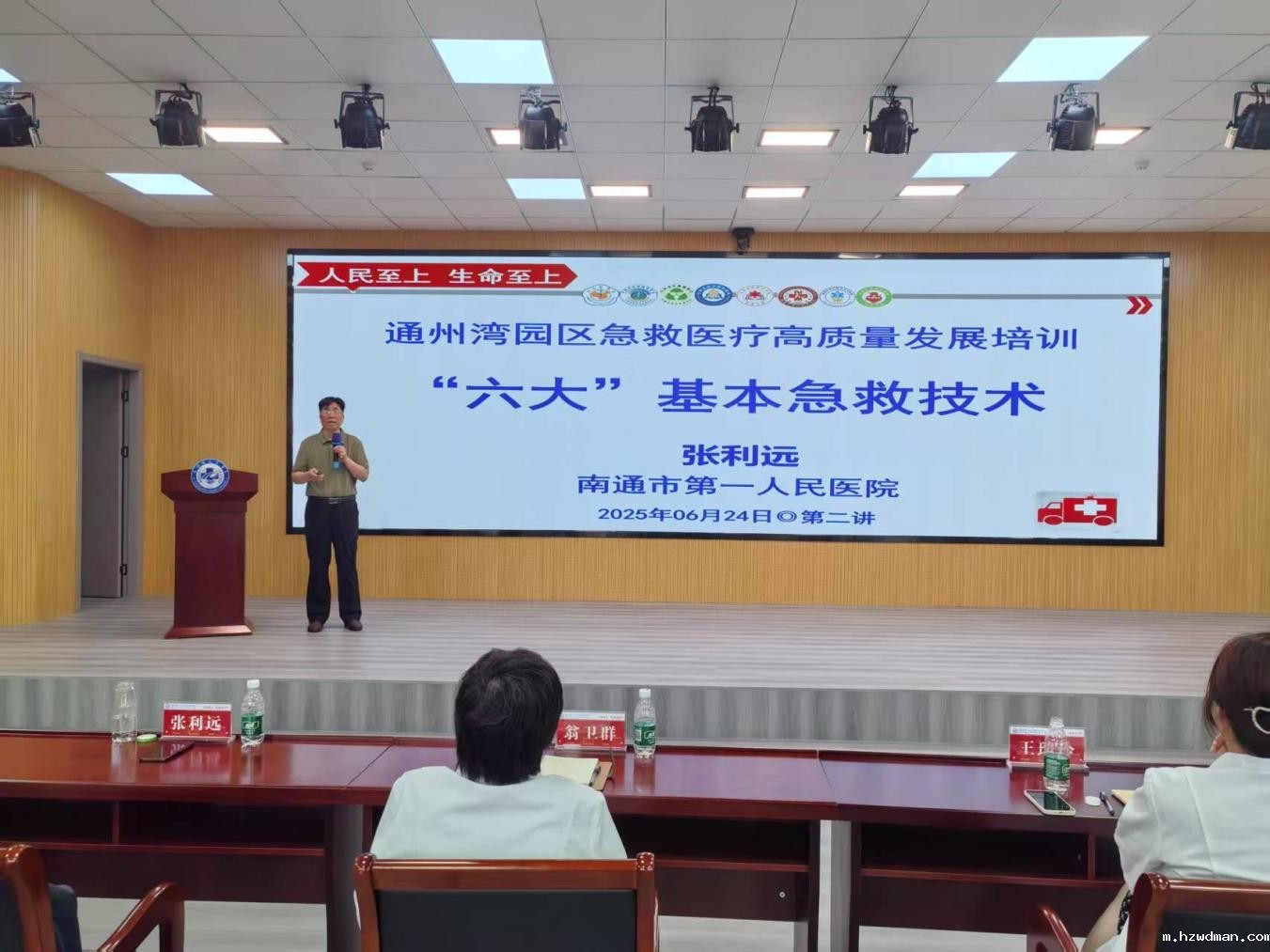 上图:张利远教授在通州湾示范区人民医院组织的“2025年蓝湾培训会-2”上,作“六大急救技术”——“创伤急救基本技术”培训。
