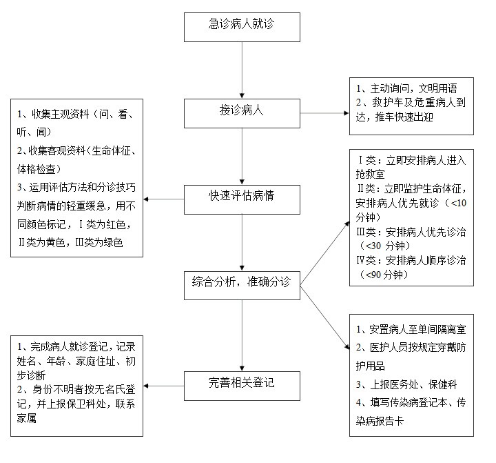 1、 预检人员根据病人病情的轻重缓急(详见急诊预检分诊细则)决定病人去向及就诊顺序,保证病人的救治: